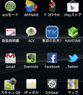 他にインストールしたものは、2chGear(2ちゃんねるビューワ)、QR Droid(QRコード)、Dropbox、NAVITIME、乗り換え案内、AirDroid、AndSMB、Opera Miniなど。
